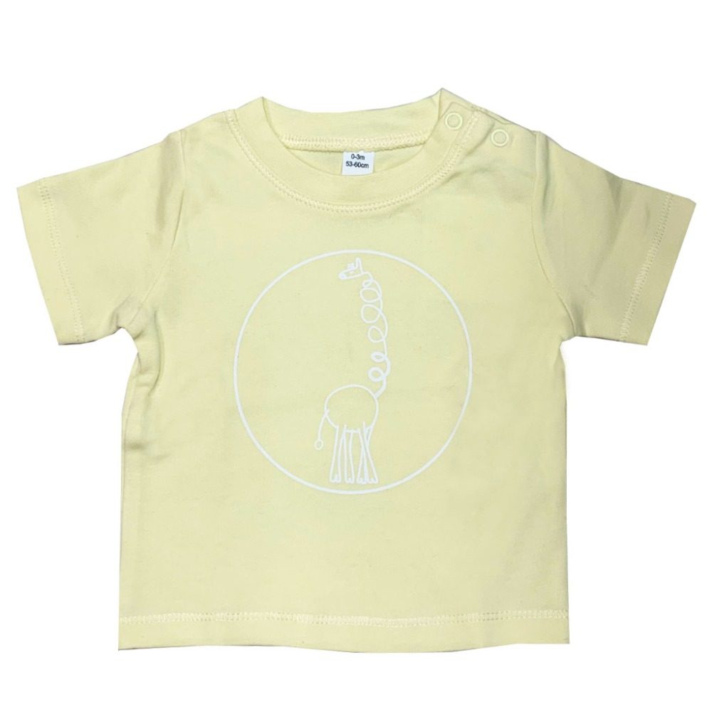 Super soft light yellow cotton t- shirt with our white giraffe logo. Closing on the shoulder with automatics in the sizes under 92cm. Iron inside out.