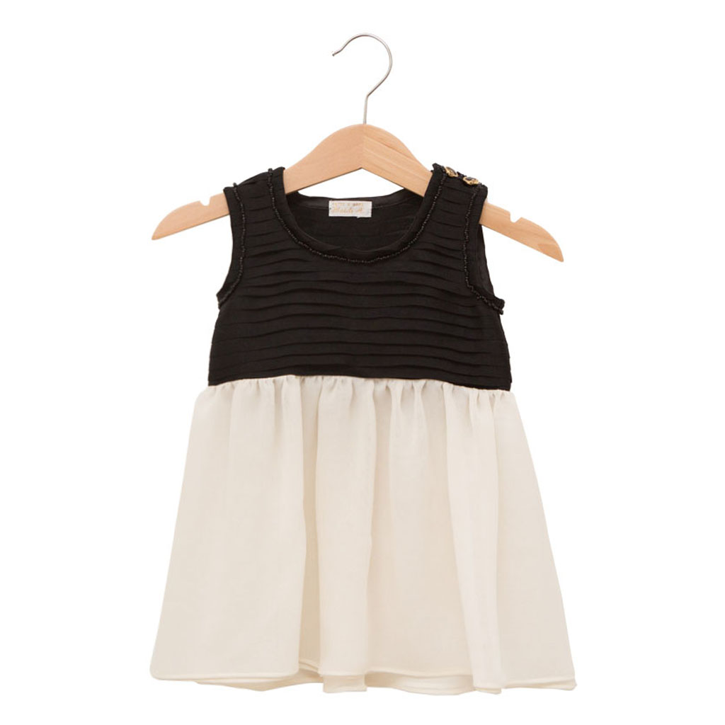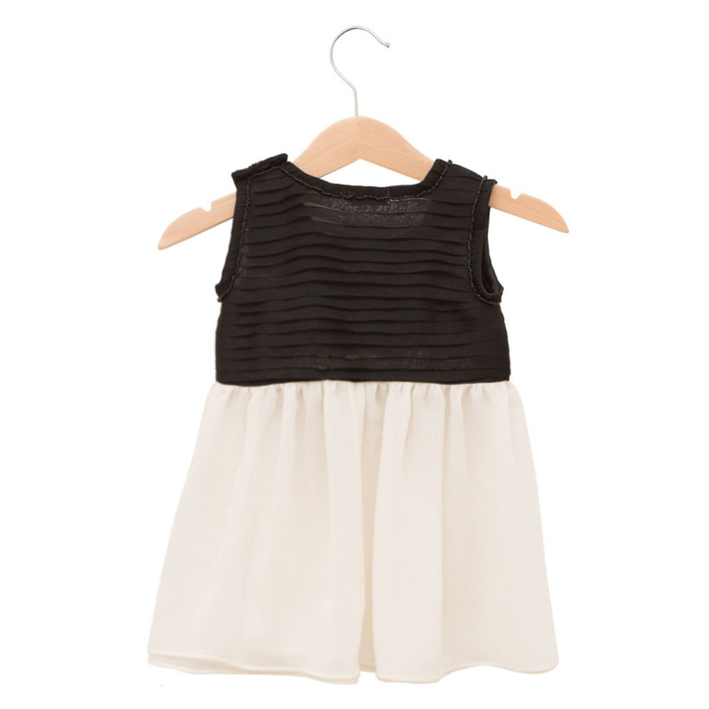 Black silk pleated top with white double layered silk skirt. Fastened with 2 buttons on the shoulder.