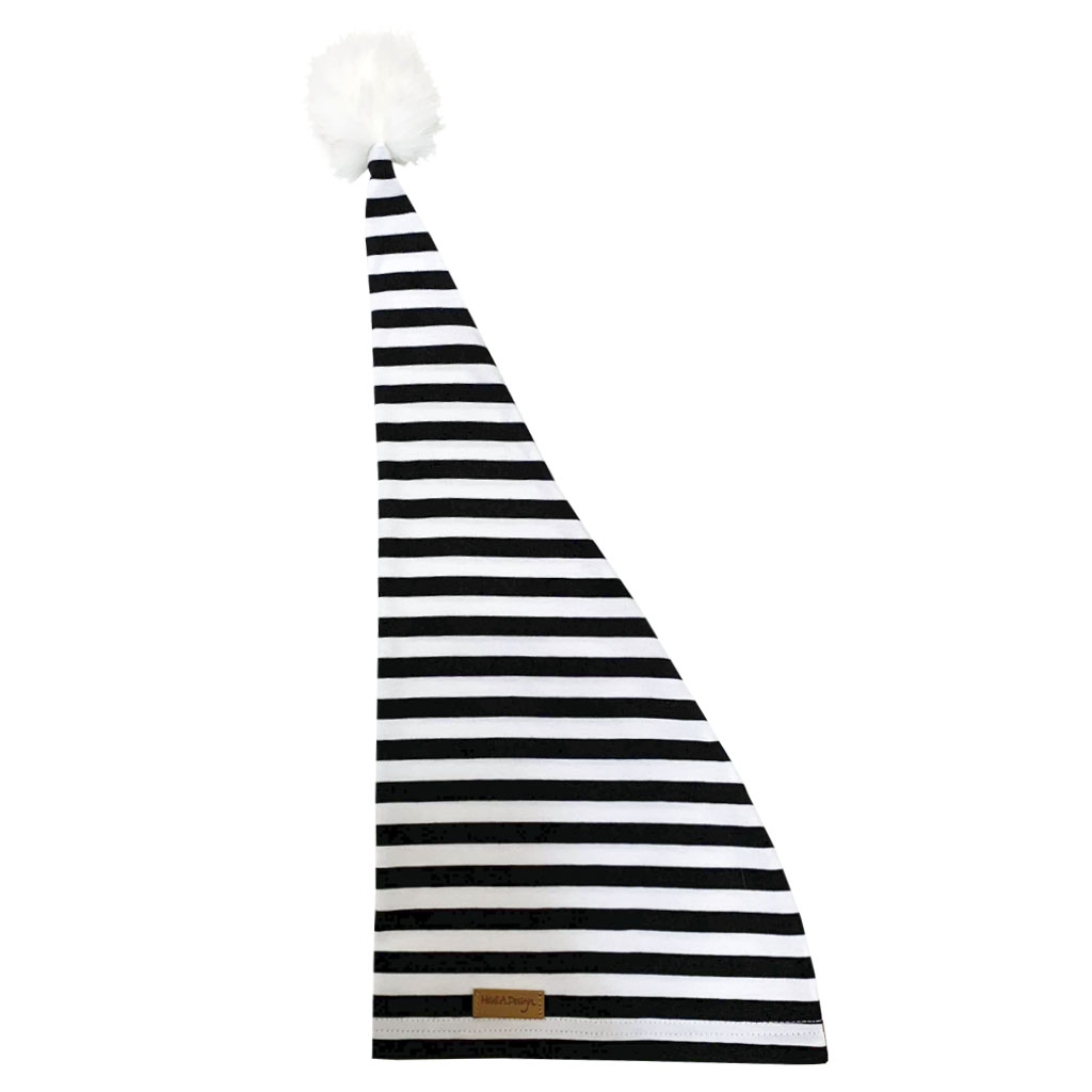 B&W striped Christmas hat with white faux fur pom pom.