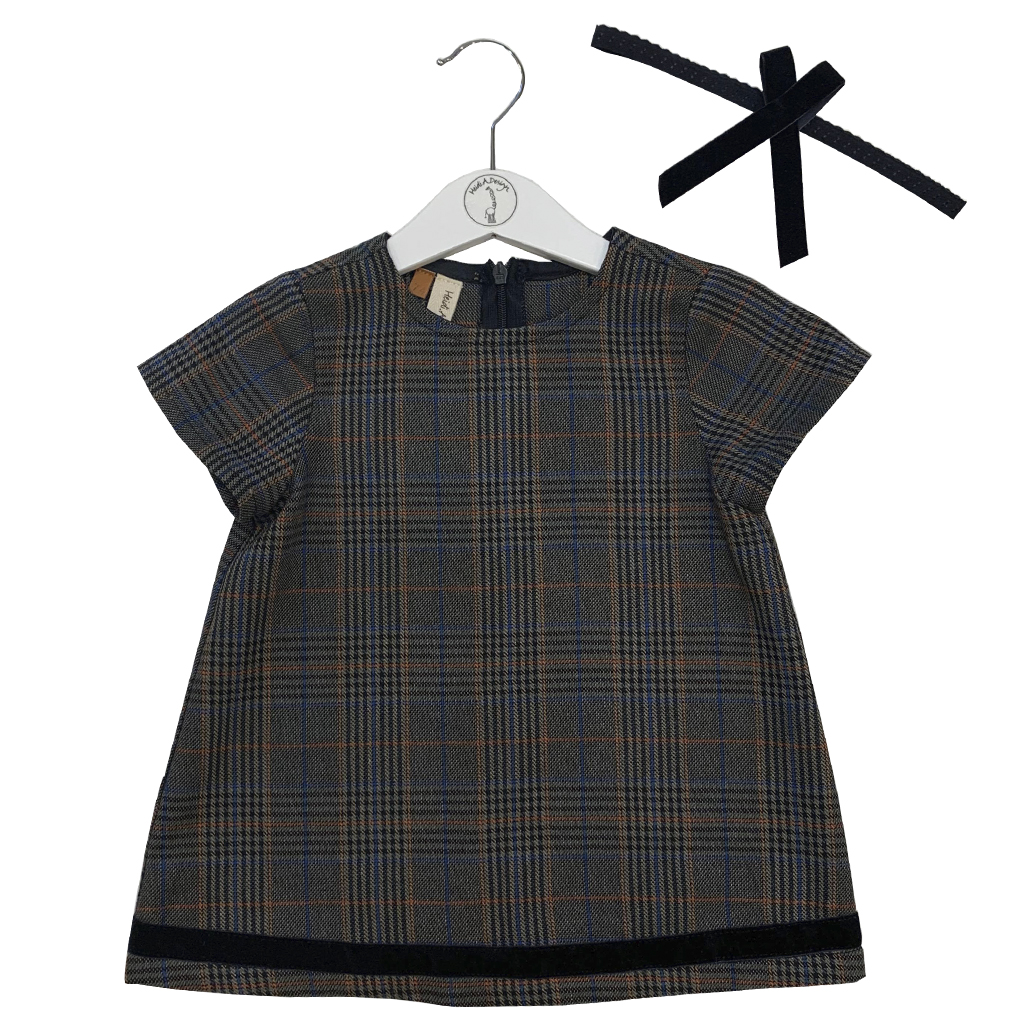 Checked pattern baby dress with a bow for little princesses. Closing in the back with invisible zipper. The dress looks super cute first as a dress and later when the baby grows up as a tunika. Great on the birthdays or other parties.