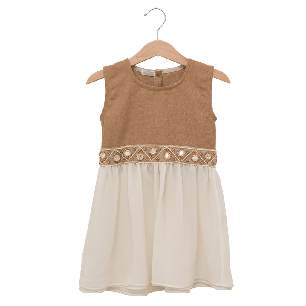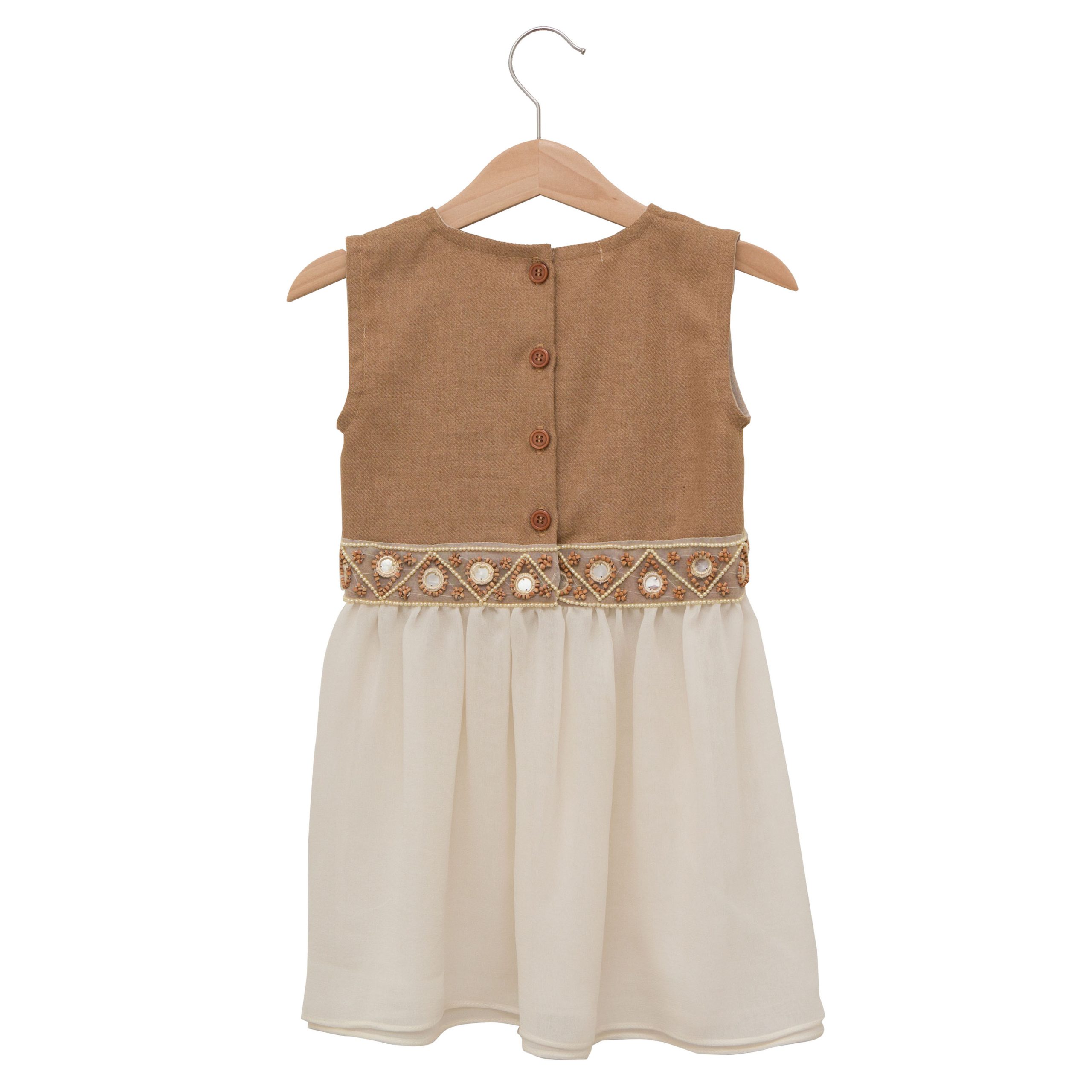 Light brown wool top with double layer silk skirt and an embroided belt. Fastened with 4 buttons on the back.