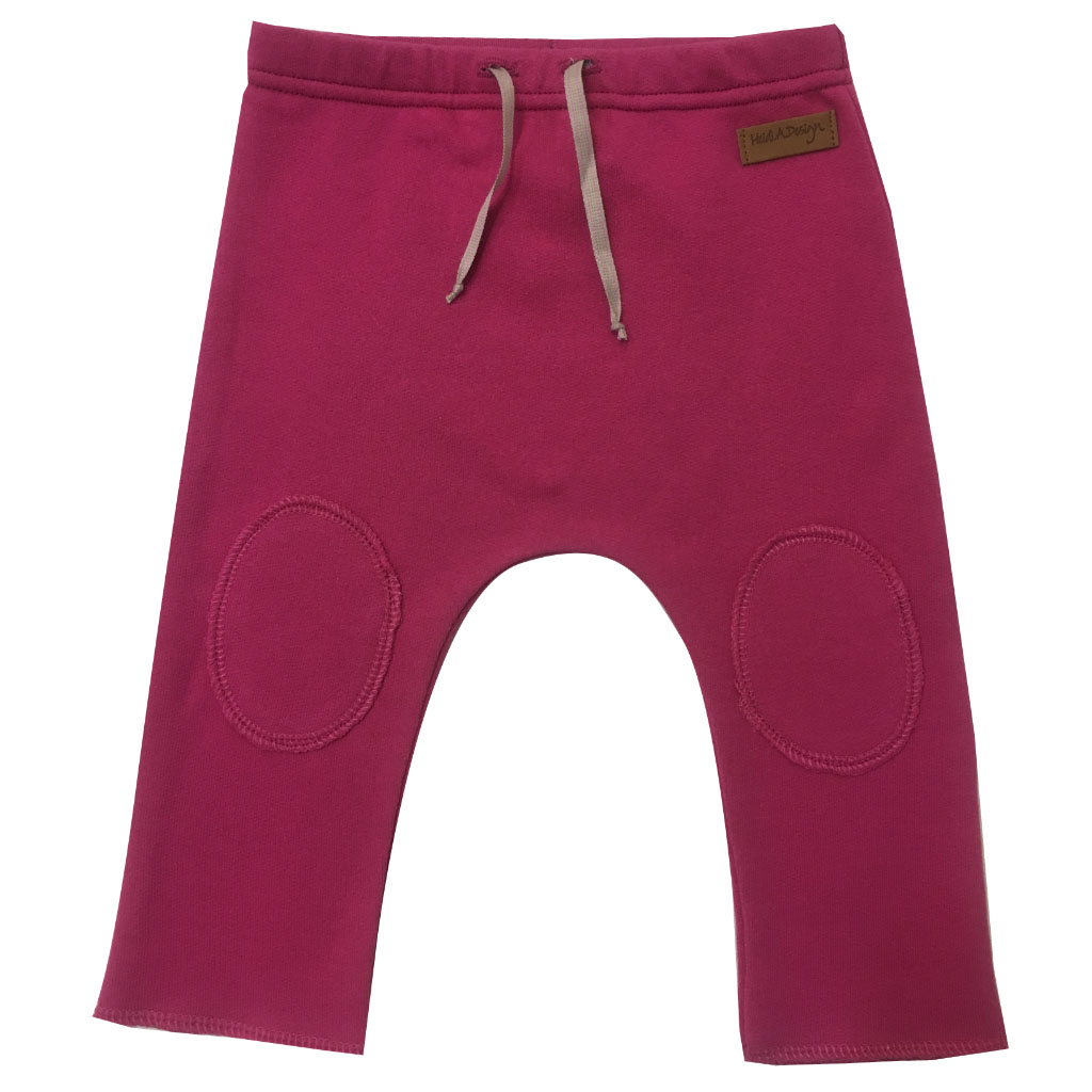 Details : Fuchsia jersey pants with knee pads. Elastic on the waist with drawstring. Raw edges. Match it with our fuchsia beanies.