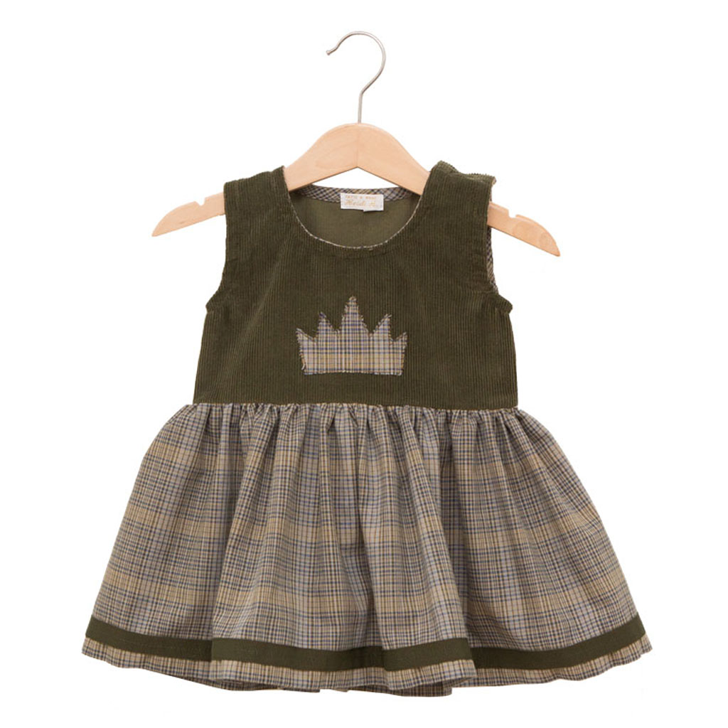 Green velvet top with a crown detail on the front, skirt in green/blue cotton plaid fabric with a cotton ribbon embroided on the hem. Fastened with 2 automatics on the shoulder.