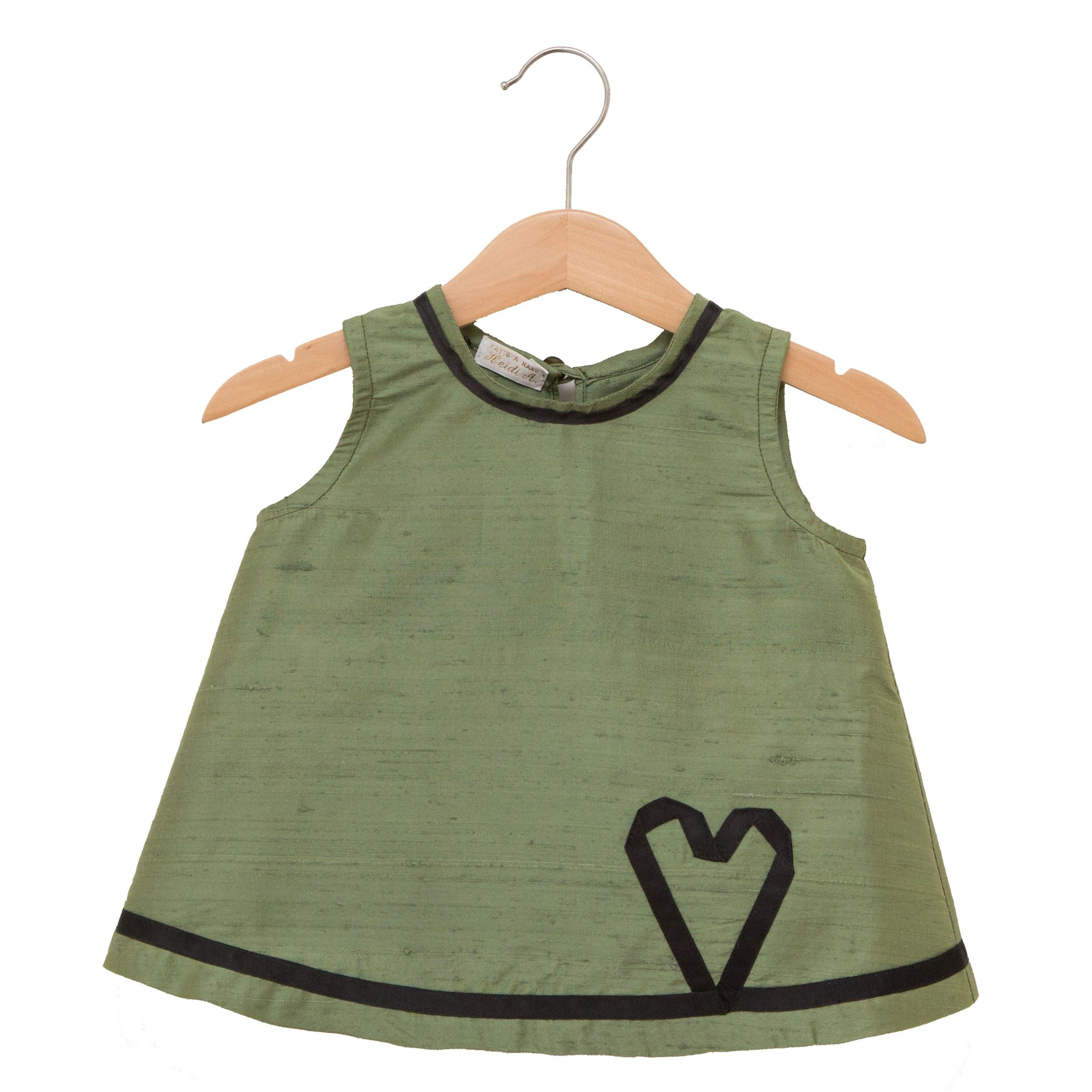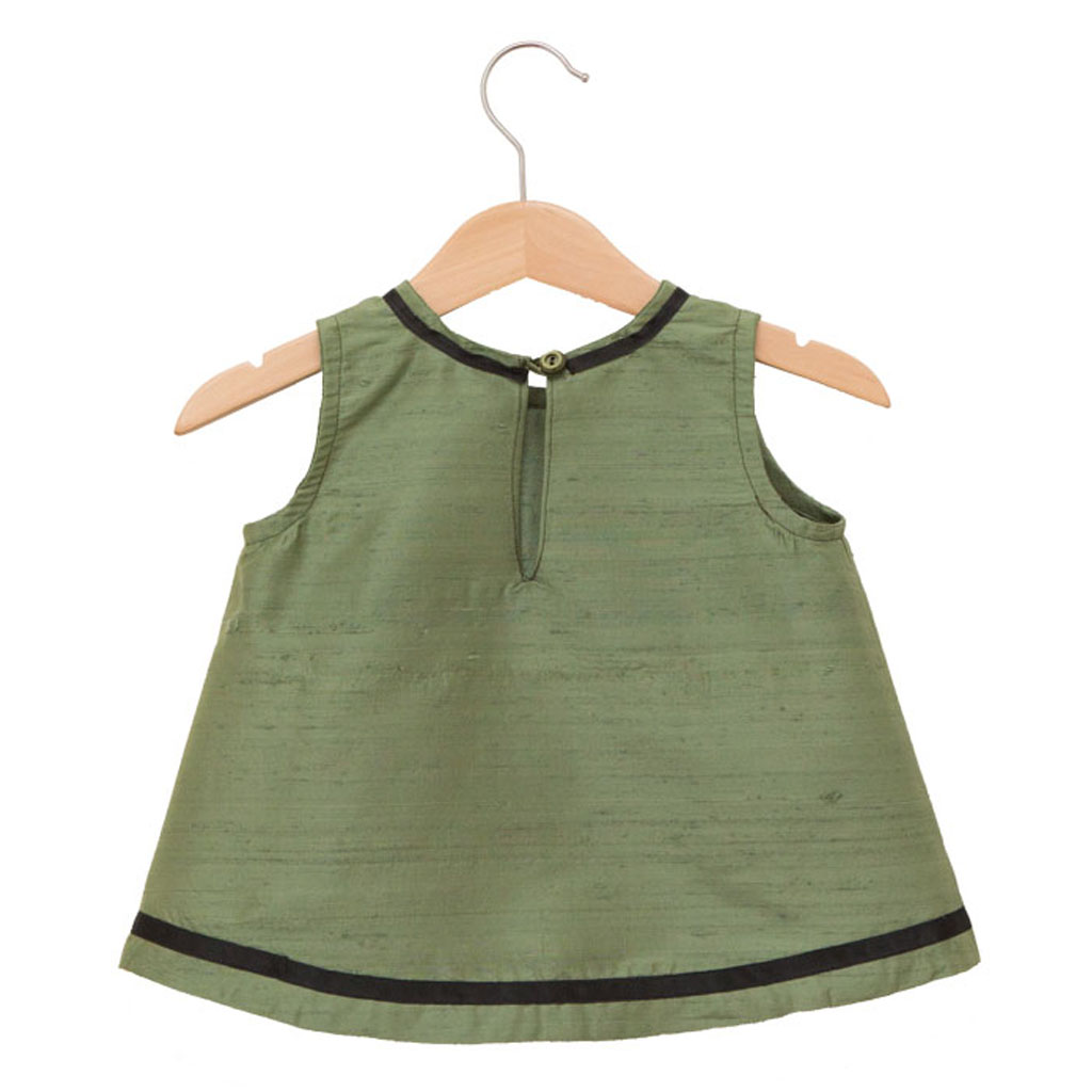 Green silk duchesse dress with the fastening in the back with a button. On the hem and on the collar a black satin ribbon detail.