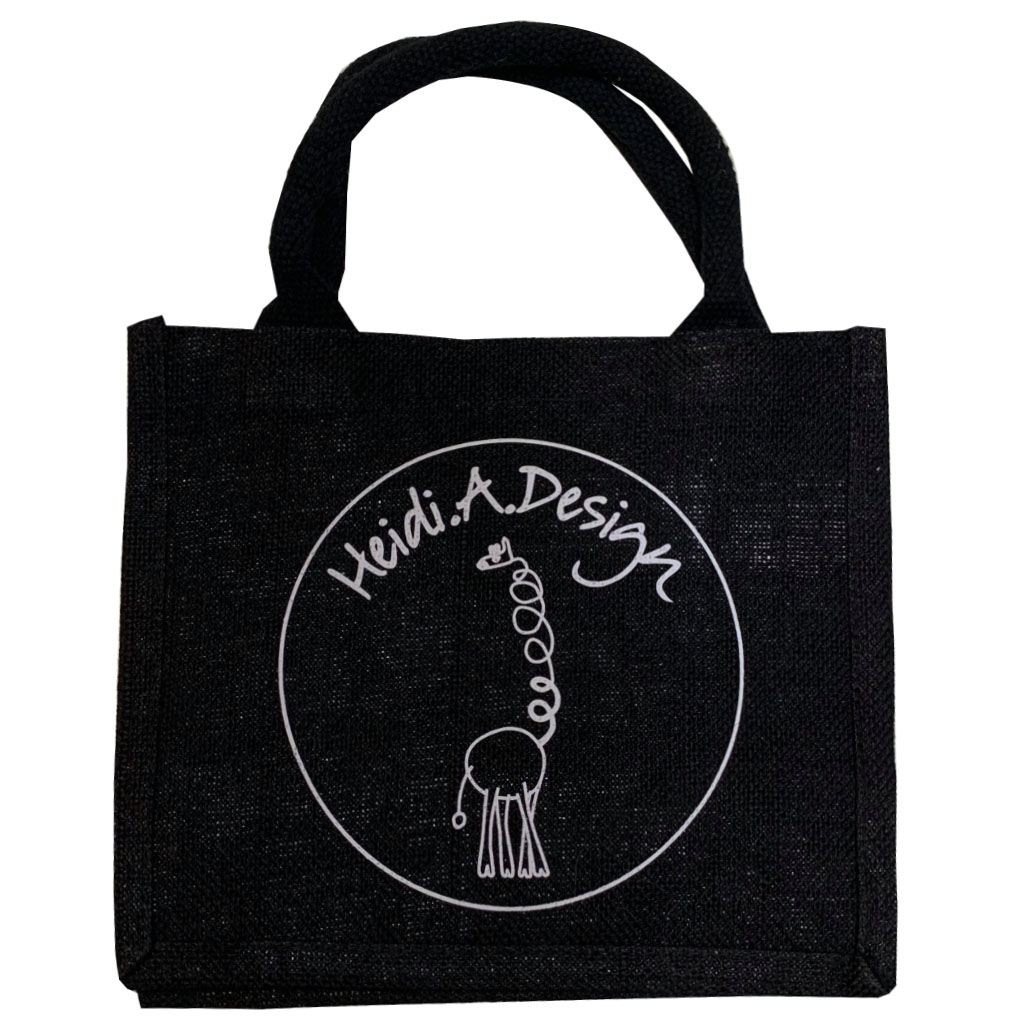 Little jute logo bag with white logo print made from a strong laminated jute. Size 26cm*22cm and handles measuring 35 cm.