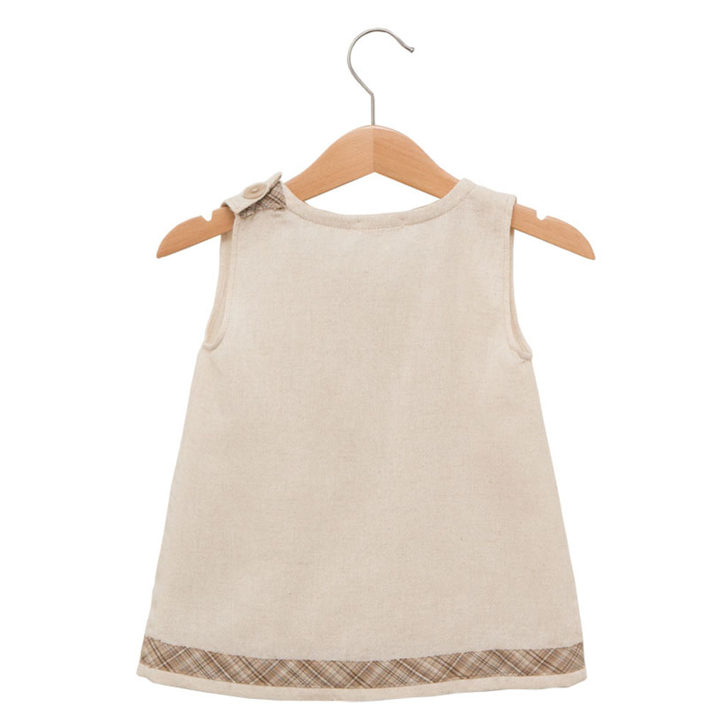 Little off-white cotton dress with a ribbon detail on the hem. Fastened with a button on the shoulder. When the baby grows can be used as a top.