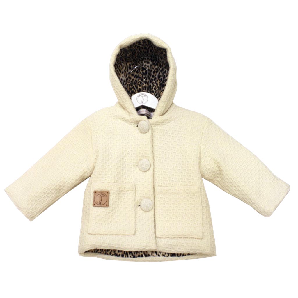 Natural white long sleeves wool coat with pockets on the front and a hood. Closing with 3 buttons. Lined with leopard printed cotton.