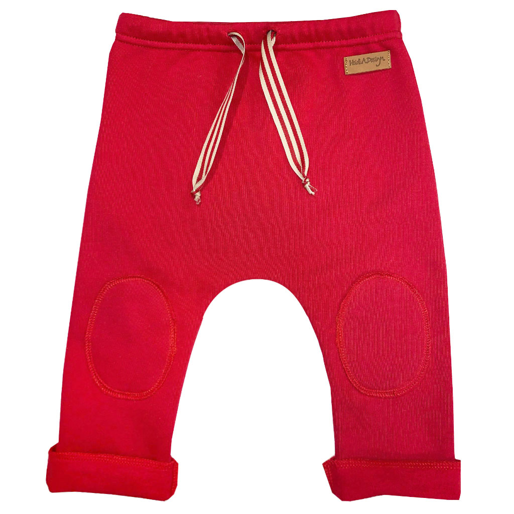 Details : Red jersey pants with knee pads. Elastic on the waist with drawstring. Raw edges. Match it with red beanie with a pom pom.