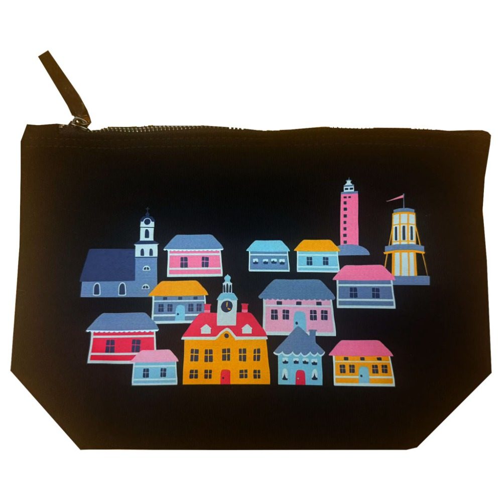 Musta pussi värikkäällä Rauman talot kuviolla, medium